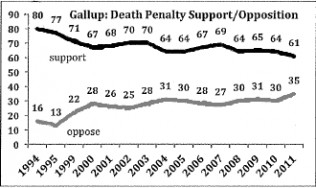 The Gallup Poll, which measures the public's support for the death penalty without offering alternatives, recorded the lowest level of support for and the highest level of opposition to the death penalty in 39 years.